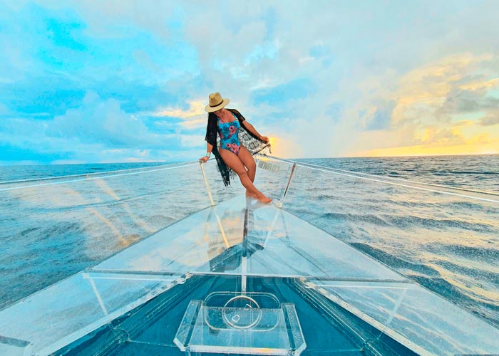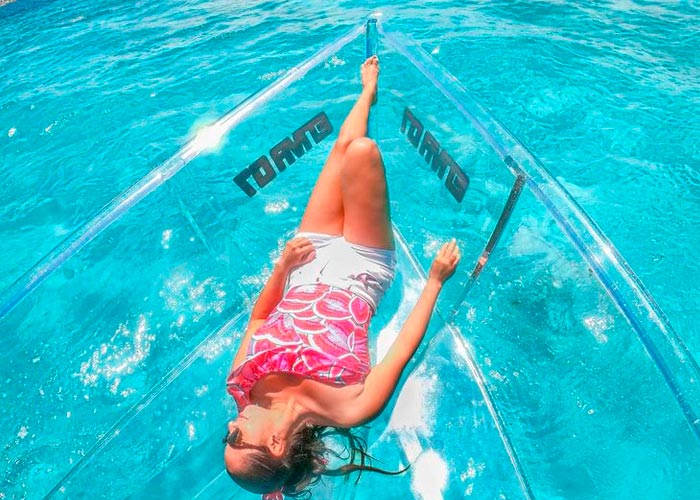 This is the Famous Clear Boat in Cozumel. As if it were taken from a Wonder Woman comic if this is a 100% transparent bottle. Book it now!